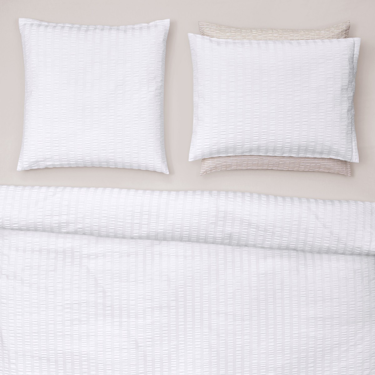 Unser neuer Seersucker FLOW ist ein grosszügiger Streifen aus reiner Baumwolle. Mit ihrer dreidimensionalen Oberfläche und pflegeleichten Eigenschaft trifft die beliebte Qualität den aktuellen Zeitgeist. Dank unterschiedlicher Spannung der Kettfäden entsteht die angenehme, lebendige Haptik des Gewebes. Die blütenweisse Oberfläche ist soft, bügelfrei und pflegeleicht und ein Klassiker in der Welt der Bettwäsche.
