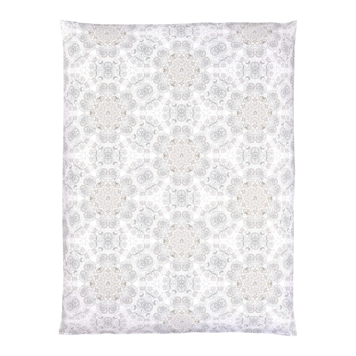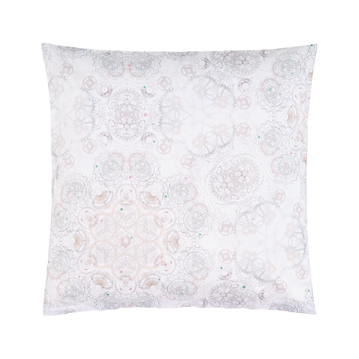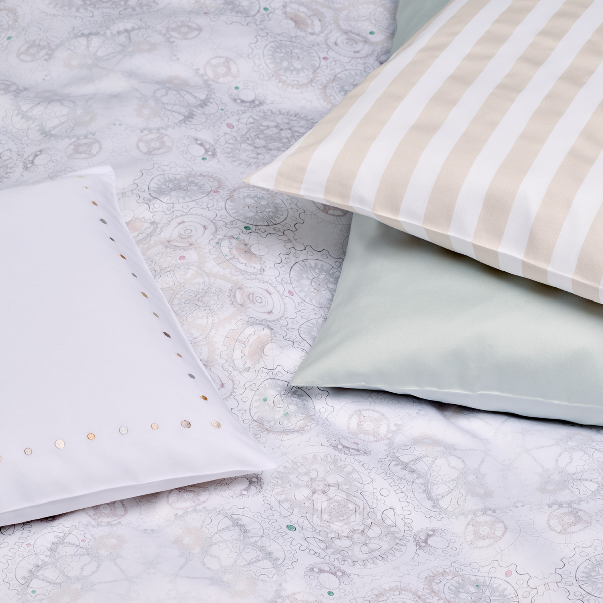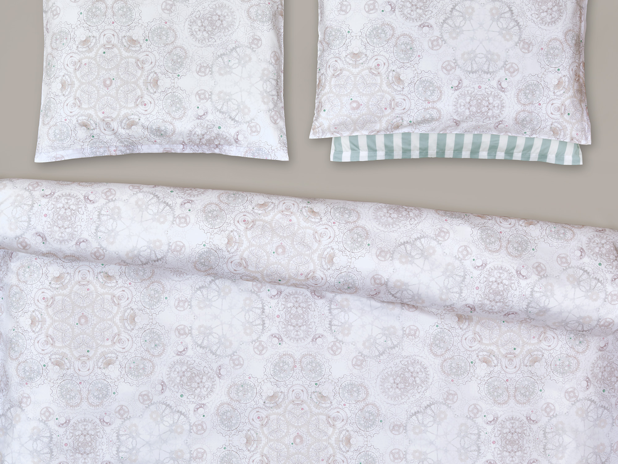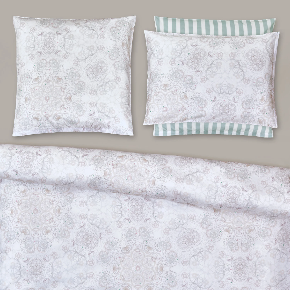 Bei der Christian Fischbacher Bettwäsche „Orario“ dreht sich alles um die Zeit und die Uhrmacherkunst. Präzision trifft auf Handwerk. Handwerk trifft auf Details. Zahnräder greifen wie durch ein Kaleidoskop betrachtet ineinander und kreieren ein ornamentales Muster. Die Farbwelt von Beige und Grau wird ergänzt durch schmuckstückartige Akzente in Rosa und Grün.