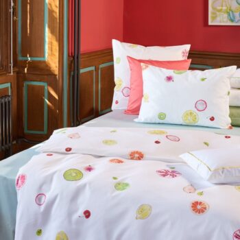 Für den Christian Fischbacher Satin verwenden wir ausschließlich zertifizierte Supima-Extra-Langstapel-Baumwolle von höchster Qualität. Unser Garn lassen wir in der sogenannten „Schweizer Einstellung“ zu unserem berühmten Satin verweben. Durch die Kombination des edlen Garns, der speziellen Webart und der Veredelung (Merzerisierung, Färbung und Endausrüstung) erhält er seinen ganz eigenen, eleganten Glanz, und ist mit 100 g/m2 viel weicher und leichter als andere Bettwäsche Satins. Der Stoff wird bei unseren Schweizer Partnern her- gestellt, mit denen wir zum Teil schon seit über 100 Jahren zusammenarbeiten.