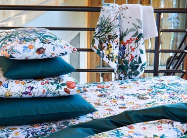 Diese Christian Fischbacher Frottier Waldboden Allover versammelt die Kostbarkeiten des Waldes und fügt sie zu einem lebhaften Druck aus reiner Baumwolle zusammen. Tannenzapfen, Beeren und Nüsse verstecken sich unter Blättern und Zweigen – mit jedem Blick lassen sich wieder neue zauberhafte Motive entdecken.