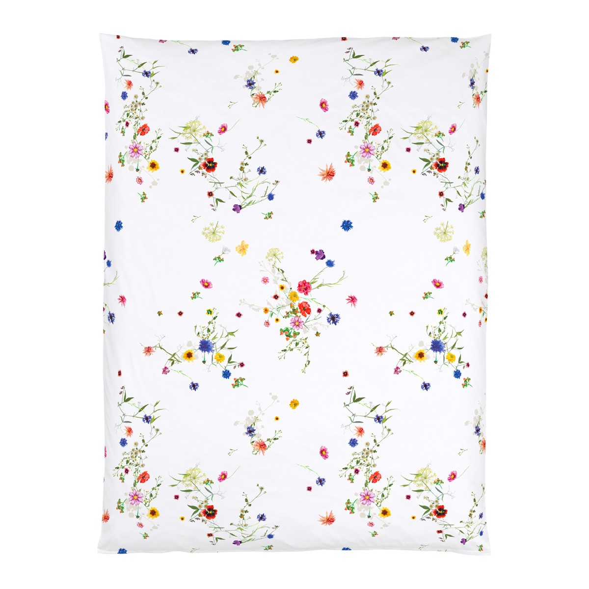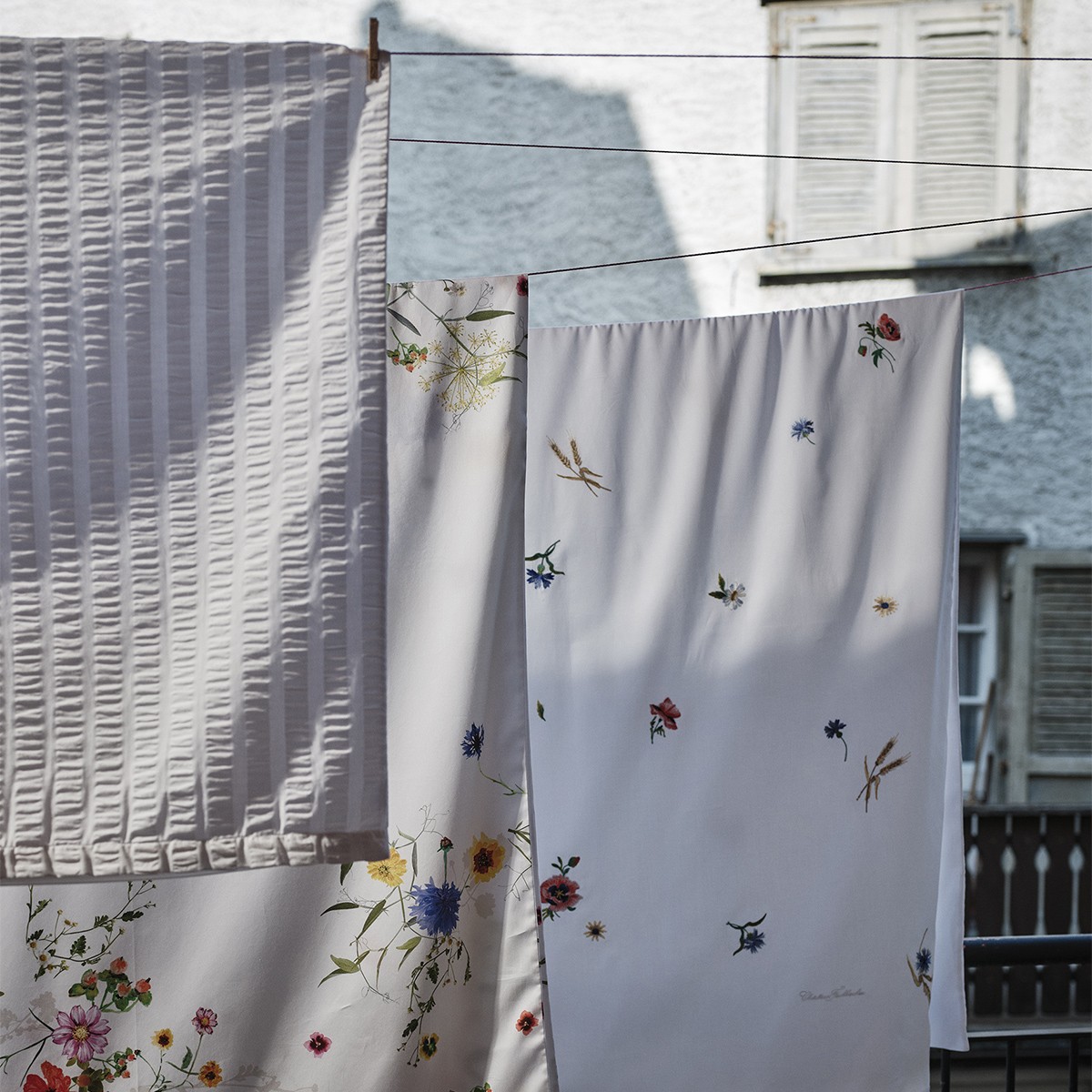 In einem Reigen mit Dahlien, Zinien und zarten Cosmeae leuchten tiefblaue Kornblumen, inspiriert von den spielerisch leichten Rauminstallationen der Schweizer Künstler Steiner/Lenzlinger, wecken die fröhlichen Blumenarrangements viel Lust auf den Sommer. Die extra-langstapelige Baumwolle als Basis für die fotografierten und von Hand gemalten Blüten und Ranken.